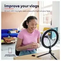 Always look your best with this light ring and add professional lighting to your vlogging channel. The 10" LED ring light casts the perfect lighting and is fully adjustable, so you look your best for any situation! The Maku vlogging kit comes with everything you need for perfect lighting including a tripod, phone clamp and wireless remote. Powered by a standard USB connection, the light works with almost any phone charger or powerbank (not included).
