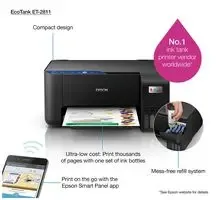 Compact and stylish multifunction printer designed for modern homes and small offices; the ET-2811 delivers print, copy and scan functions combined with wireless connectivity for mobile printing via the Smart Panel app. Minimise refills and massively reduce ink costs with EcoTank, the next generation ink filling system.