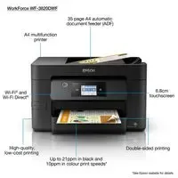 Business quality 4-in-1 inkjet printer that is ideal for homes and small offices; the WF-3820DWF delivers fast, cost-effective printing with wireless connectivity and automatic document feeder.